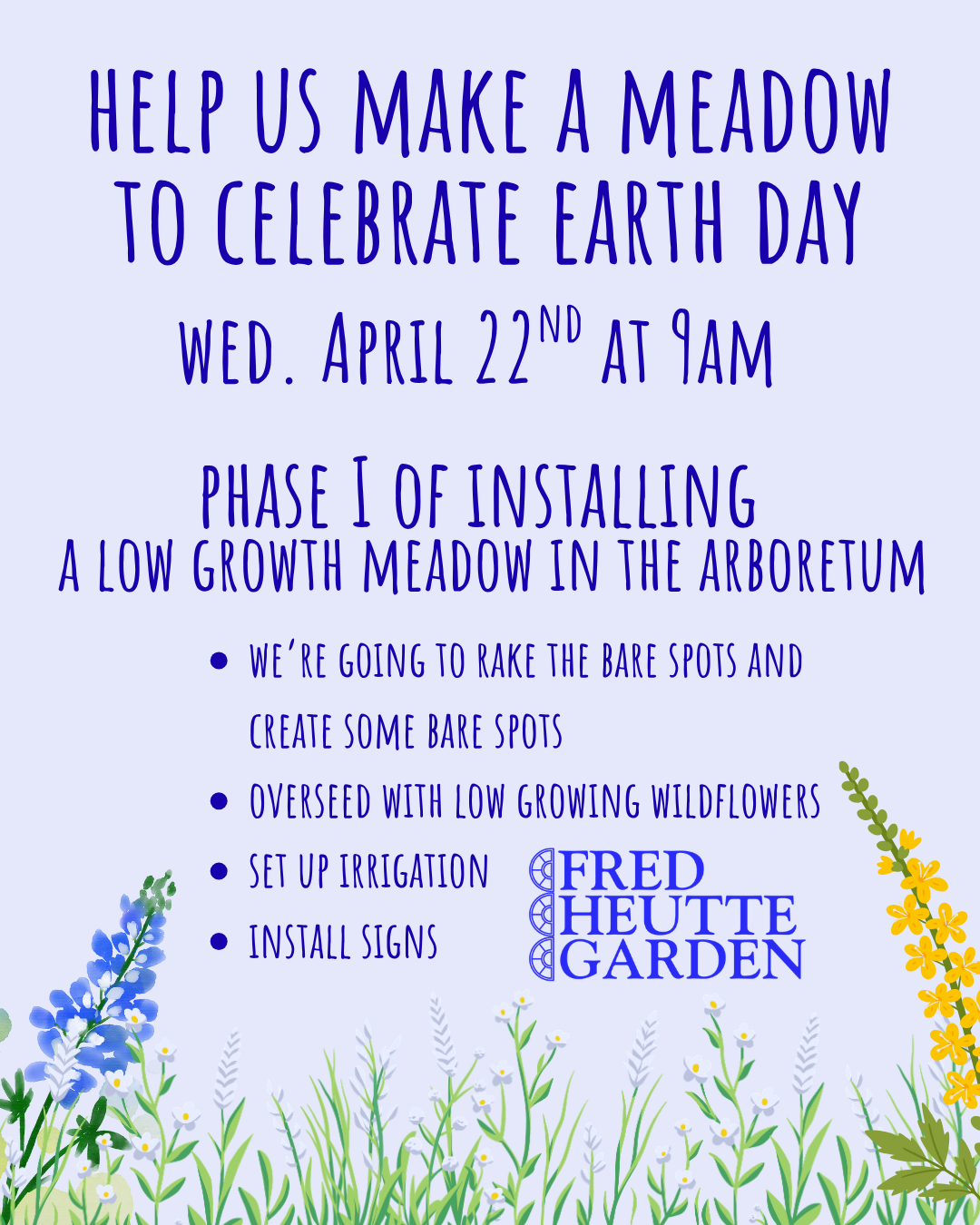 Join us for a hands-on Earth Day morning as we begin Phase One of our low-growth meadow. Volunteers will help rake and prepare the soil, overseed summer meadow plants, set up irrigation, and install signage that will bring this space to life.